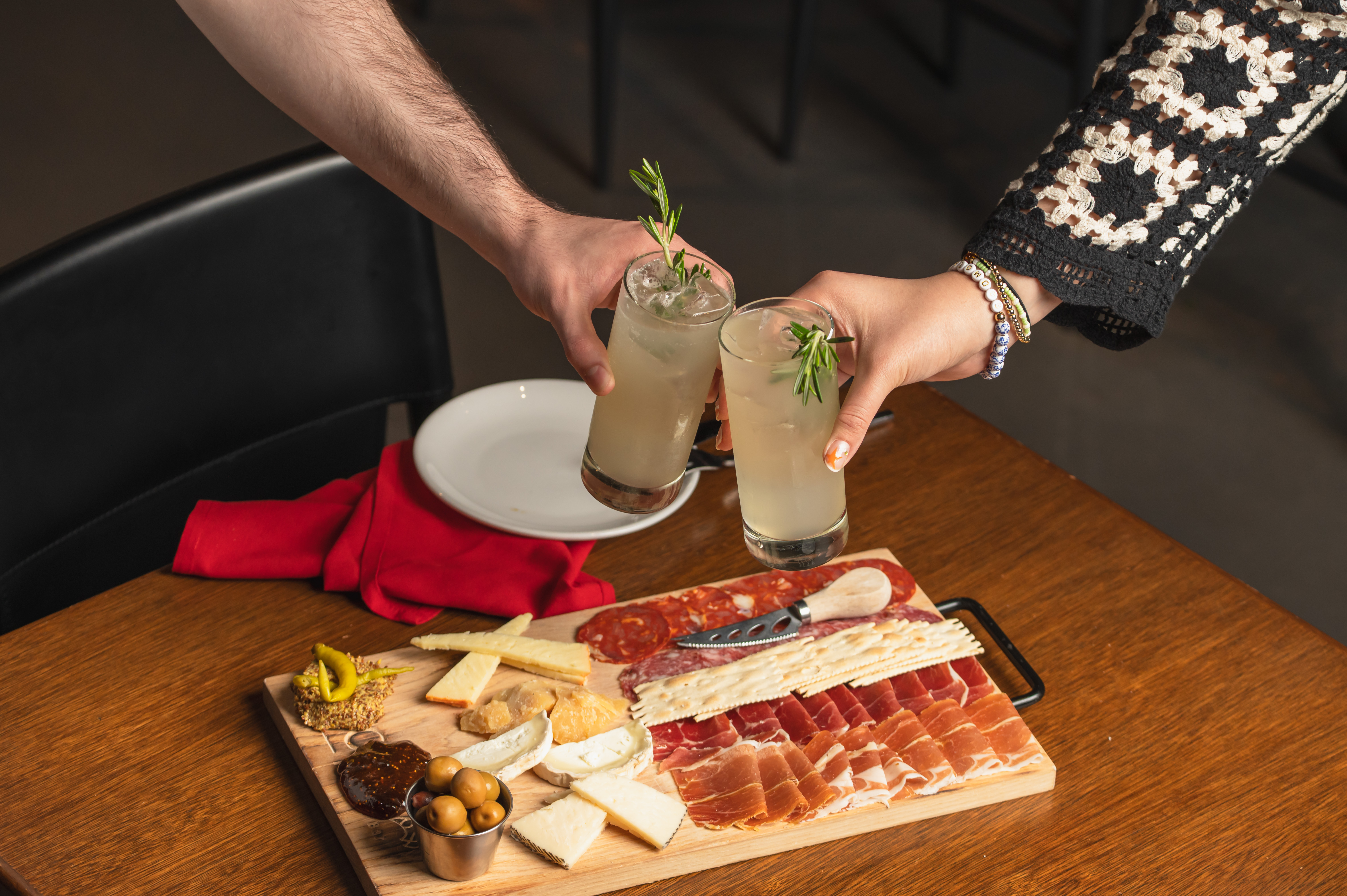 – Craft-your-own Gin Bar with playful garnishes – Spritzers, Mojitos, Sangría & Chupitos – Spanish beers + classic Pasa el Porron